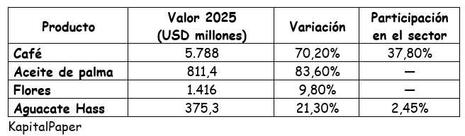 El agro como nuevo motor: El aumento en su participación en el total exportado en 33,2%, liderado por café (+70%), aceite de palma (+83,6%) y frutas de exportación.