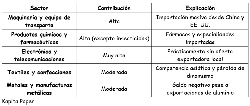 A pesar del crecimiento exportador, las importaciones aumentaron un 10% en 2025, generando un déficit de USD $16.377 millones. Los sectores que más contribuyen a este desbalance son: