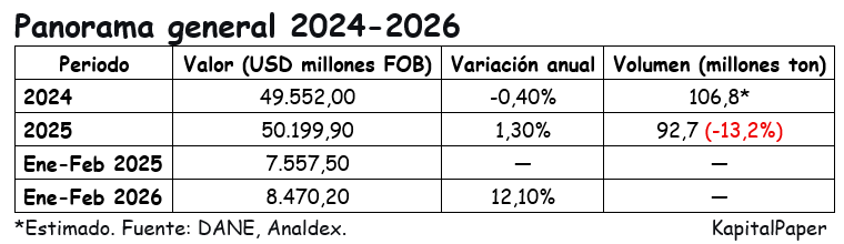 Entre 2024 y 2026, las exportaciones colombianas han mostrado una transformación inédita. El modesto crecimiento agregado, del 1,3% en 2025, alcanzando USD $50.199 millones, esconde un cambio profundo en la canasta: los combustibles y extractivos se contrajeron un 17,9%, mientras el agropecuario creció un 33,2% y las manufacturas un 4,8%. Sin embargo, este viraje no ha sido suficiente para evitar el peor déficit comercial de la historia: USD $16.377 millones en 2025, explicado casi en su totalidad por el desbalance con China.