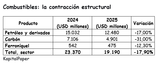 Analdex atribuye la caída a la política gubernamental de restricción a la exploración, sumado a menores precios internacionales y menor demanda de China, en donde los derivados de hulla cayeron 90,2%. A lo anterior se suma un dato revelador: en diciembre de 2025 se exportaron 15,1 millones de barriles de petróleo (+3,7% en volumen), pero el valor en dólares cayó 22,6% por el desplome de precios.
