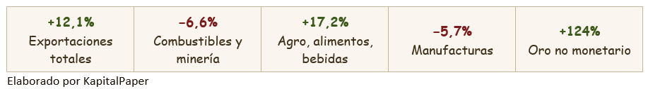 El crecimiento del 12,1% en enero-febrero está liderado por productos de bajo valor agregado o alta volatilidad de precios: el oro no monetario creció 124,3% y explica prácticamente todo el dinamismo del grupo “Otros sectores”; el banano subió 117% y el café 16,1% en un contexto de precios internacionales elevados.