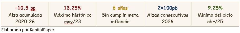 La tasa de intervención acumula un aumento de 10,5 puntos porcentuales desde septiembre de 2020. En 2026 se completarían seis años consecutivos sin que la inflación se ubique en el rango meta del 2% al 4%. Los dos incrementos consecutivos de 100 pb en 2026 no tienen precedente reciente.
