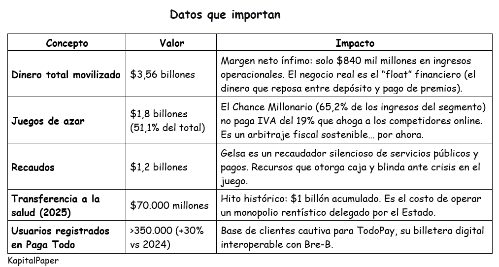 Gelsa la empresa de juegos de azar transita a una plataforma logístico-financiera en donde el juego del chance y su red Paga Todo constituyen su medula. El 65,2% de sus ingresos de juego dependen del Chance Millonario (blindado fiscalmente), mientras su apuesta de futuro, TodoPay, se prepara para disputarle el terreno a Nequi y a la banca tradicional.